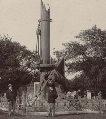 FOTO FOTO Kilkumetrowa iglica z czerwonego granitu ustawiona była na czworobocznym piedestale ozdobionym wykonanymi z brązu wieńcami laurowymi i medalionami z portretami: cesarza Wilhelma I, kanclerza Bismarcka i gen. Moltke.